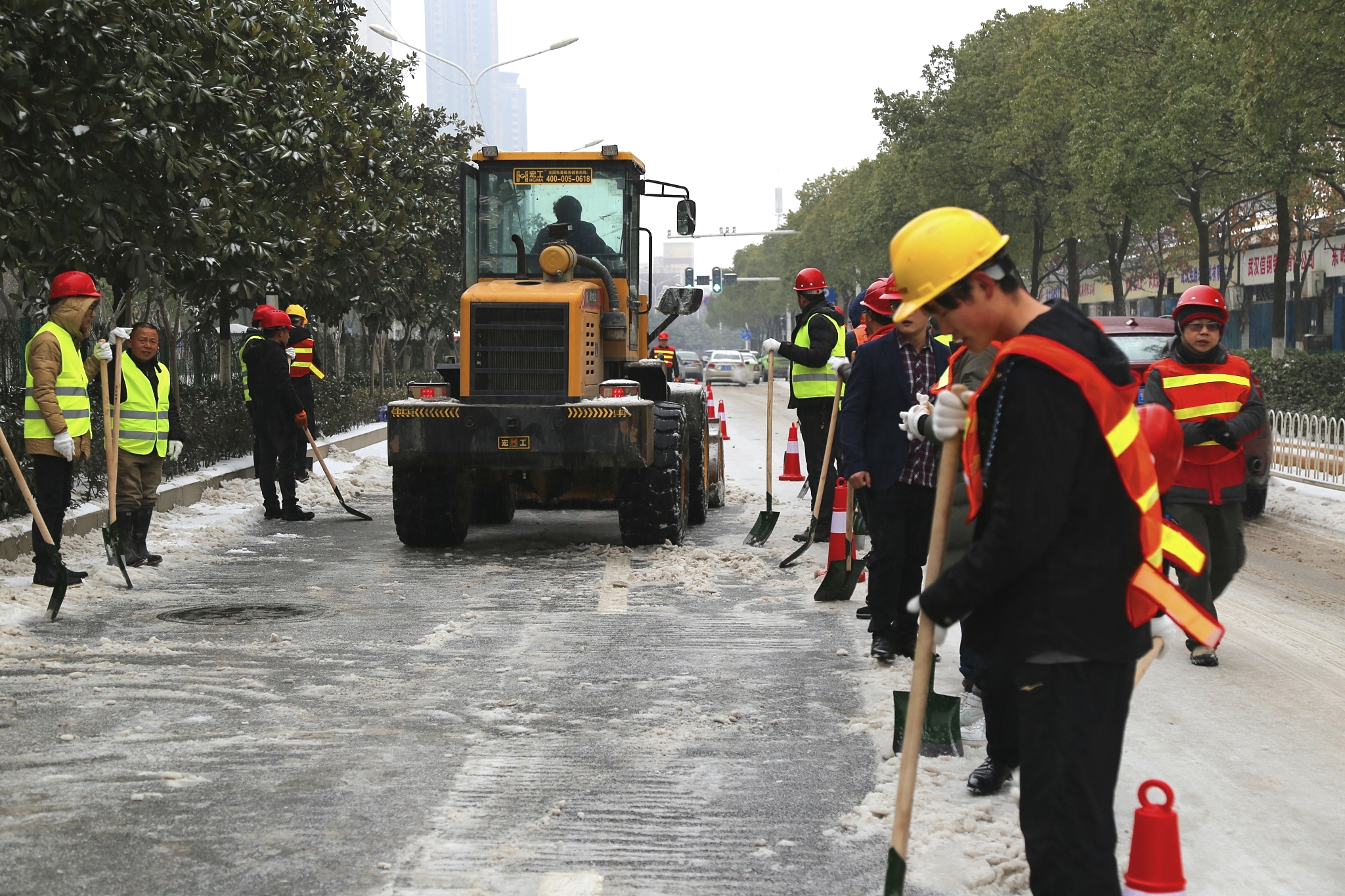 本次行動中公司出動人員160余人,正鏟車7臺,防凍手套、反光背心、礦泉水等物資一應(yīng)俱全,董事長兼總經(jīng)理錢濤親自帶隊指揮,領(lǐng)導(dǎo)班子集體出動來到一線參與除雪,部分干部職工更是不顧個人感冒的身體情況,堅持親自參與除雪,并駐守現(xiàn)場指揮調(diào)度。這次行動中,無論是老職工還是新員工,大家手腳齊用,人車并進,熱情高漲。氣溫雖寒,道路雖長,但架不住博宏建設(shè)廣大職工高漲的熱情與高效的作業(yè),截止當天下午6點,琴臺大道全線單邊除雪基本完成,車輛通行無阻。