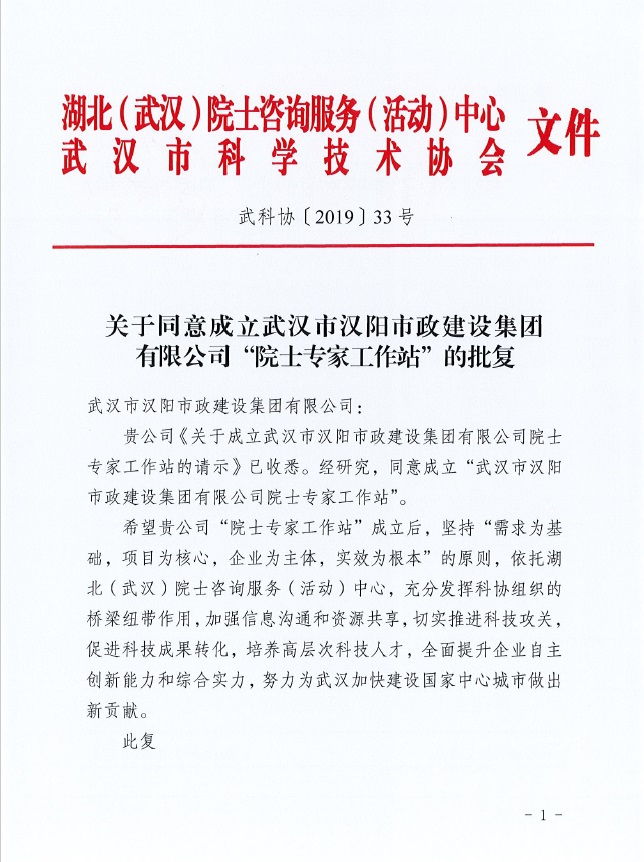 2019年5月20日,湖北(武漢)院士咨詢服務(wù)(活動(dòng))中心、武漢市科學(xué)技術(shù)協(xié)會(huì)正式批復(fù)同意成立武漢市漢陽(yáng)市政建設(shè)集團(tuán)有限公司院士專家工作站。