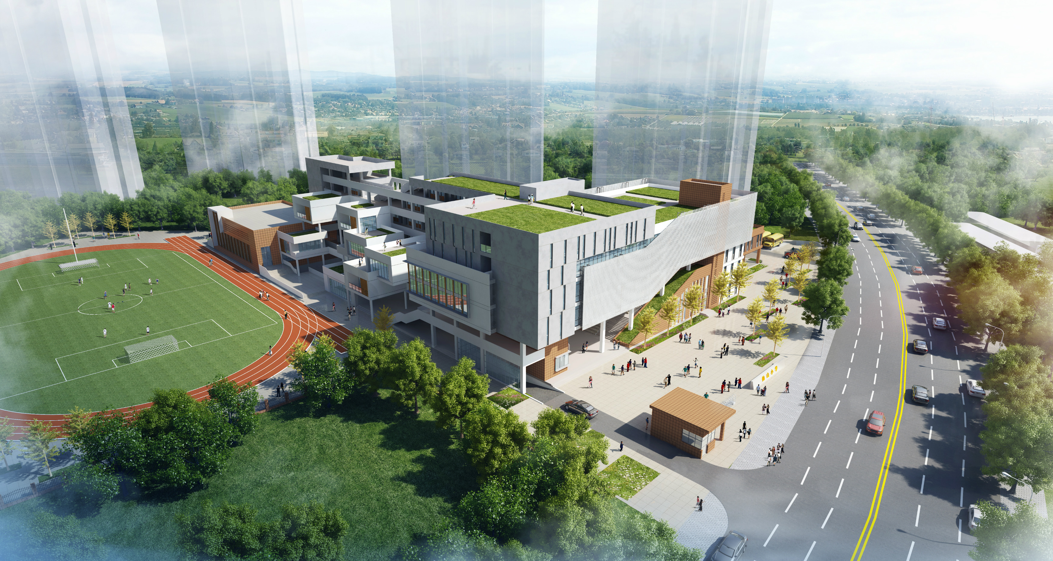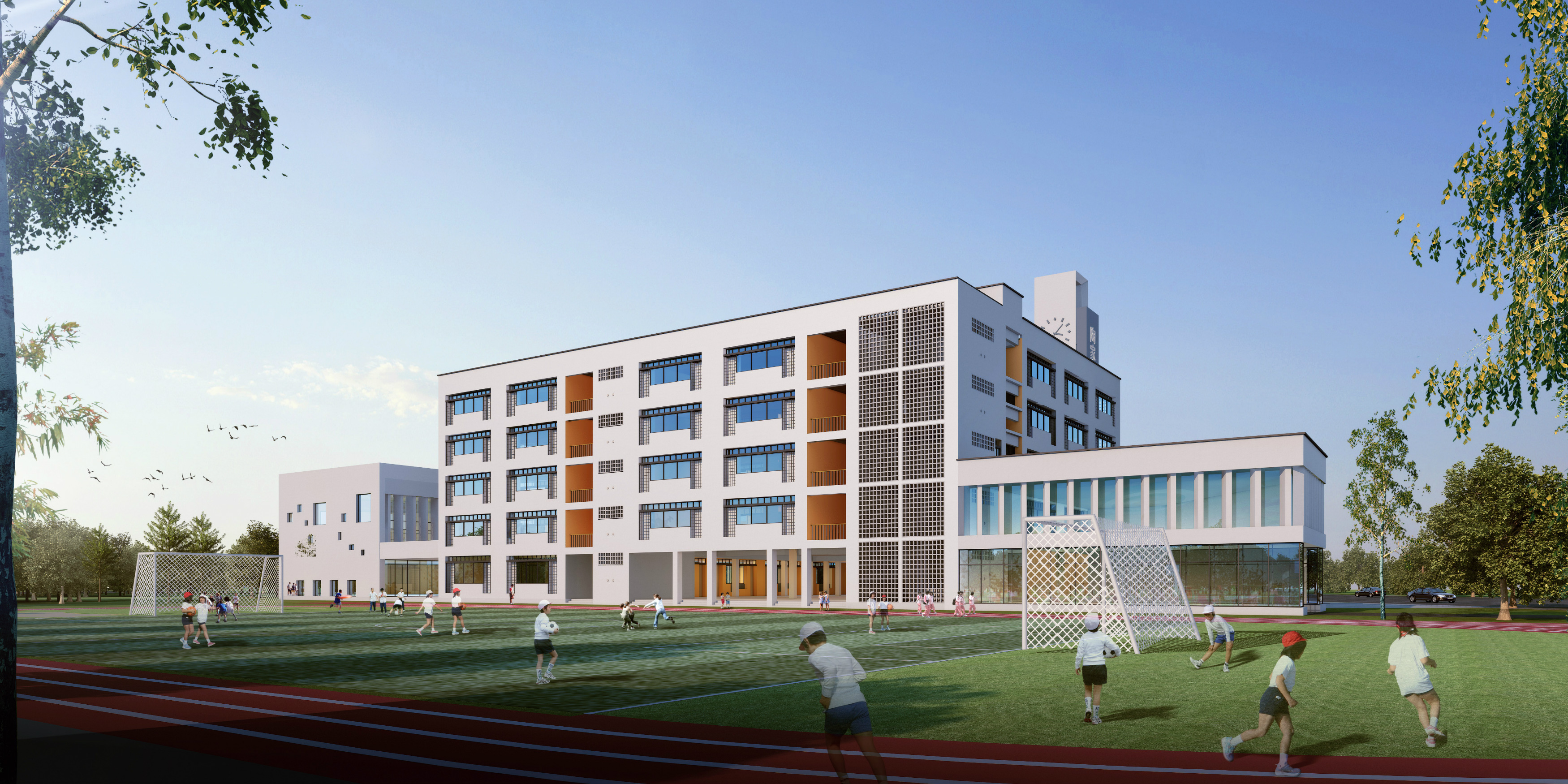 建設(shè)內(nèi)容:六層教學(xué)綜合樓 1 棟,配套建設(shè)學(xué)校大門、道路及停車場、運(yùn)動場地(含足球場、籃球場、羽毛球場、器械區(qū)、跑道等)、綠化等工程。