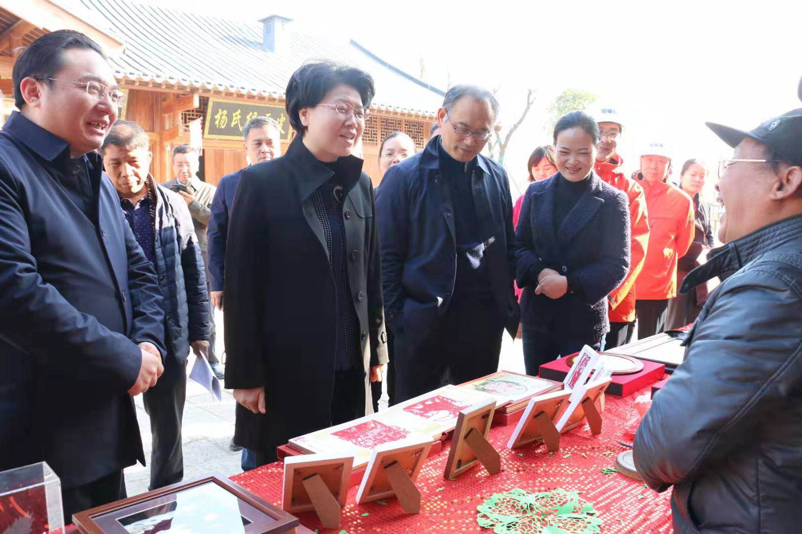 肖菊華一行走進項目現(xiàn)場,在項目負責人的陪同和講解下,參觀了沔陽小鎮(zhèn)迎客廳、商業(yè)街、云野夢田服務中心及樣板間等區(qū)域,并觀賞了沔陽傳統(tǒng)花鼓戲《站花墻》選段,欣賞了沔陽非物質(zhì)文化遺產(chǎn)代表作雕花剪紙、沔陽貝雕、麥稈畫等。肖菊華在考察項目建設情況的過程中,親切地同文化傳承老藝人進行了交流,一方面肯定了老藝人們對沔陽文化的堅守,另一方面對項目整體設計和構造所呈現(xiàn)出來的獨特文化展示平臺表示了認可。