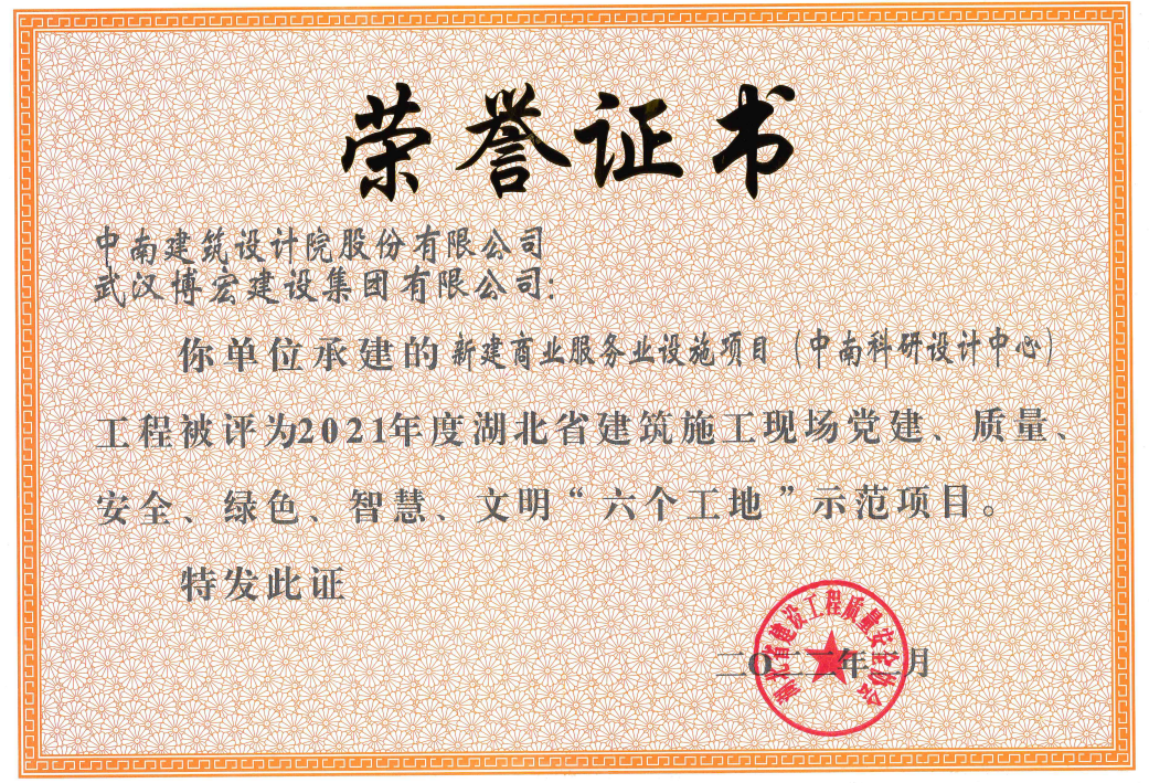 近日,2021年度湖北省建筑施工現(xiàn)場黨建、質(zhì)量、安全、綠色、智慧、文明“六個(gè)工地”評(píng)比結(jié)果正式公布,全省共計(jì)97項(xiàng)工程被評(píng)為示范項(xiàng)目,博宏建設(shè)新建商業(yè)服務(wù)業(yè)設(shè)施項(xiàng)目(中南科研設(shè)計(jì)中心)和博宏建設(shè)旗下合資公司湖北長投建筑工程有限公司承建的荊門龍山中央商務(wù)區(qū)7#地塊項(xiàng)目雙雙獲獎(jiǎng)。