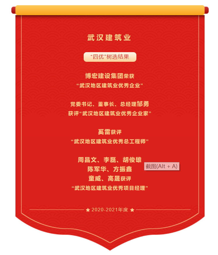? ? ? ? 近日,武漢建筑業(yè)協(xié)會(huì)發(fā)布2020-2021年度武漢地區(qū)建筑業(yè)優(yōu)秀企業(yè)、優(yōu)秀企業(yè)家、優(yōu)秀總工程師、優(yōu)秀項(xiàng)目經(jīng)理(以下稱為“四優(yōu)”)選樹(shù)結(jié)果。經(jīng)會(huì)員單位自主申報(bào)、協(xié)會(huì)組織專家評(píng)審、主管部門復(fù)核、武漢建協(xié)三季度會(huì)長(zhǎng)辦公會(huì)審議通過(guò)并在協(xié)會(huì)網(wǎng)站進(jìn)行公示,“四優(yōu)”選樹(shù)結(jié)果名單火熱出爐。博宏建設(shè)集團(tuán)榮獲“武漢地區(qū)建筑業(yè)優(yōu)秀企業(yè)”;黨委書(shū)記、董事長(zhǎng)、總經(jīng)理鄒勇獲評(píng)“武漢地區(qū)建筑業(yè)優(yōu)秀企業(yè)家”;奚雷獲評(píng)“武漢地區(qū)建筑業(yè)優(yōu)秀總工程師”;周昌文、李磊、胡俊雄、陳軍華、方振鑫、童威及高晟獲評(píng)“武漢地區(qū)建筑業(yè)優(yōu)秀項(xiàng)目經(jīng)理”。