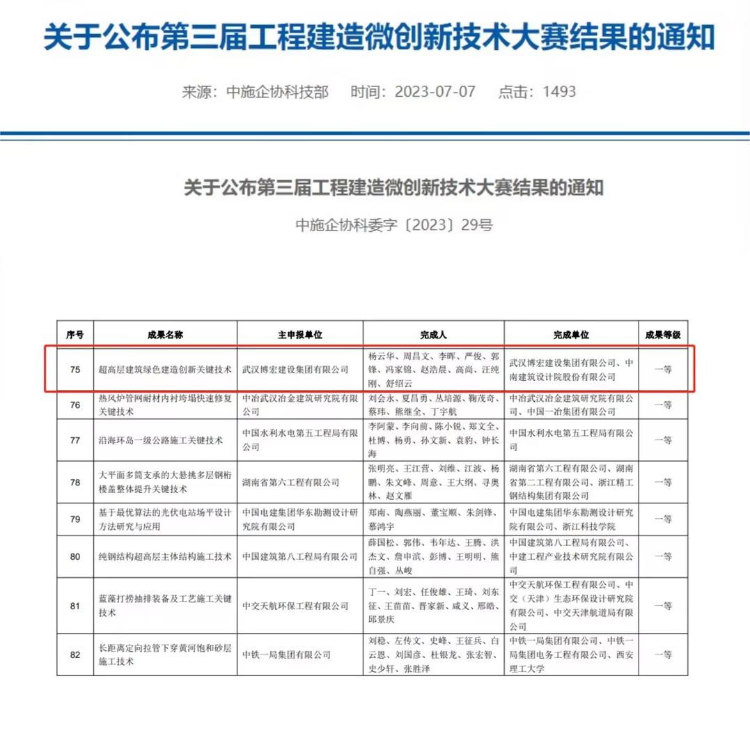 近日,中國(guó)施工企業(yè)管理協(xié)會(huì)公布第三屆工程建造微創(chuàng)新技術(shù)大賽獲獎(jiǎng)結(jié)果。以中南科研設(shè)計(jì)中心建設(shè)項(xiàng)目為背景的“超高層建筑綠色建造創(chuàng)新關(guān)鍵技術(shù)”榮獲中施企協(xié)第三屆工程建造微創(chuàng)新技術(shù)大賽一等成果,這也是博宏建設(shè)集團(tuán)首次獲得該類(lèi)賽事一等獎(jiǎng)。