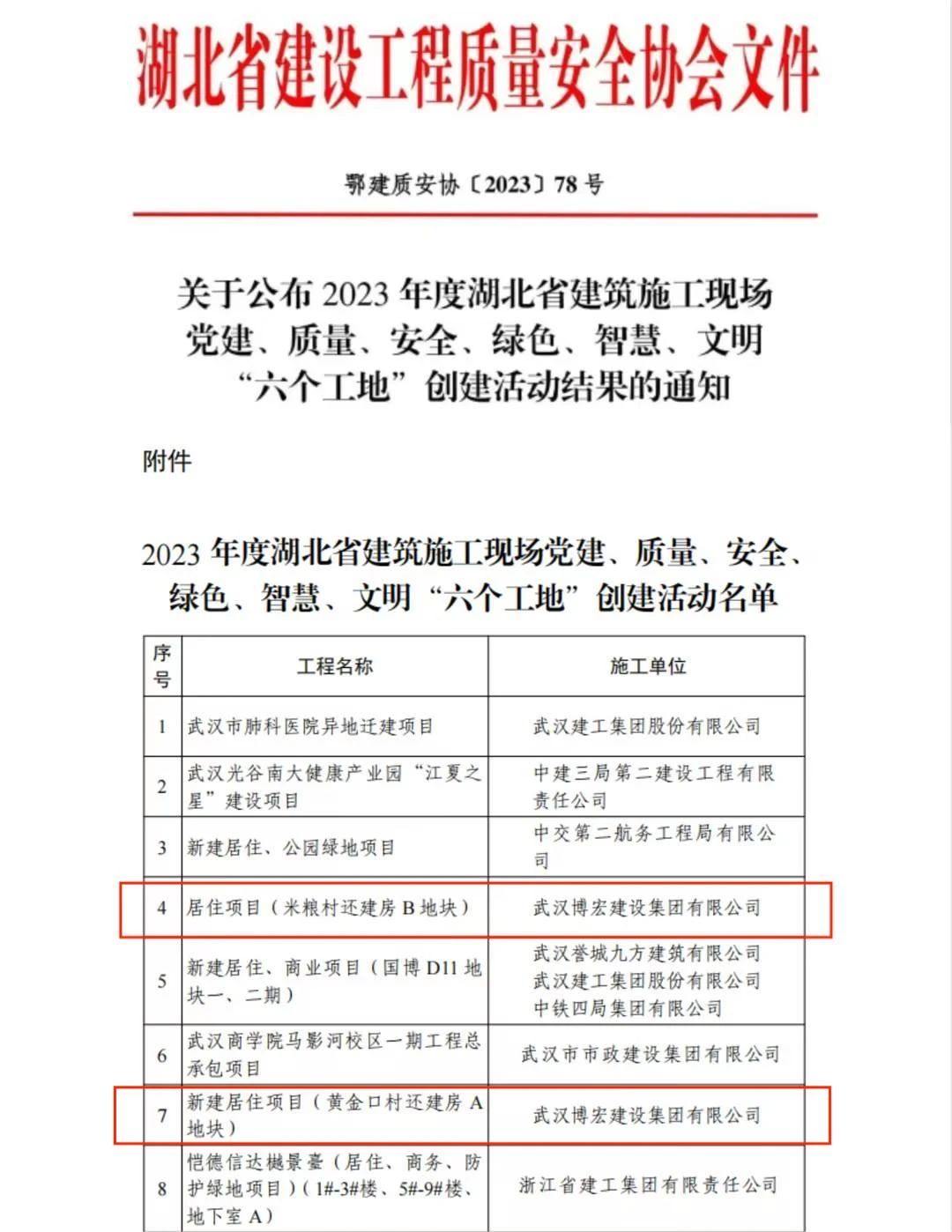 近日,湖北省建設(shè)工程質(zhì)量安全協(xié)會公布了2023年度湖北省建筑施工現(xiàn)場黨建、質(zhì)量、安全、綠色、智慧、文明“六個工地”評比結(jié)果名單,由博宏建設(shè)集團(tuán)承建的居住項目(米糧村還建房B地塊)、新建居住項目(黃金口村還建房A地塊)喜獲殊榮。