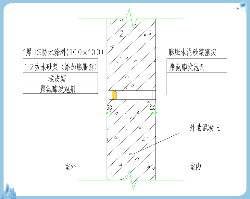 孔洞需清理并濕潤,橡皮塞需塞緊,膨脹水泥砂漿需堵塞密實(shí),發(fā)泡膠密實(shí)度需保證,JS 防水厚度及范圍需保證。